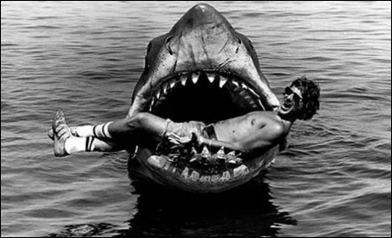El caso es que el escualo del film no era tan temible como Spielberg nos hizo creer ¡Ni mucho menos! La realidad es que el tiburón protagonista era todo un buenazo, y si no me creen, miren esta foto en la que acomoda sus fauces a modo de sillón para que Spielberg se siente a disfrutar del panorama…