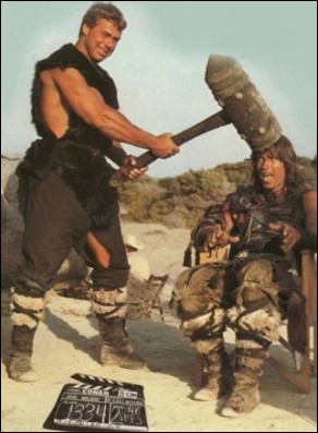 En la película (rodada para nuestro orgullo en España) Arnold tenía que hacer frente al poderoso Thulsa Doom (un genial James Earl Jones) que se apoyaba en los músculos de sus dos colosales esbirros interpretados por los titanes Sven-Ole Thorsen y Ben Davidson (Thorgrim y Rexor). Pues bien, y pese a lo que pudiera parecer por las peleas que Conan tenía con ellos en la película, lo cierto y verdad es que al final de cuentas, tanto Conan como Thorgrim eran unos divertidos colegas a los que les iba mucho la guasa…