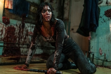 Antes me he referido al estilo violento en la dirección de Matt Bettinelli y Tyler Gillett. Y, efectivamente, esto es así. Aquí toda la violencia se funde con la temática de terror que siempre acompaña a los vampiros. Inclusive, RS lleva el terror más allá al plagar de gore y sangre muchas escenas del segundo acto del film. Tan es así que nos alejaremos de la elegancia y porte de personajes como Drácula para regodearnos con cabezas cercenadas, explosiones de cuerpos, piscinas de cadáveres putrefactos y sangre por un tubo. Esto provocará que algunas estancias queden totalmente empapadas del rojo elixir de la vida. Y todo esto realizado con efectos prácticos, prótesis y maquillaje de toda la vida bajo el lema de “cuanto más… mejor”. Atención también a los tremendos colmillos que presentan los vampiros que nos recuerdan a los del clásico ‘Noche de miedo’ (Tom Holland, 1985).
