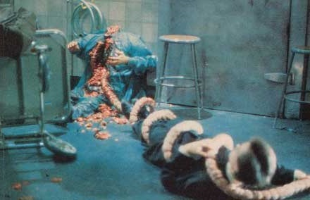 Y hablando de muertos reanimados y horror. Todo está recreado en base a efectos prácticos y una notable labor de maquillaje. En el film veremos gran cantidad de sangre en el segundo acto procedente de cadáveres, descuartizamientos, amputaciones, decapitaciones,… Imposible olvidar aquí la mítica cabeza parlante que se mantiene con “vida” de forma imposible en una bandeja gracias al suero y la sangre. Todavía actualmente estas escenas presentan un gran nivel de acabado visual. Y, por cierto, la citada cabeza, y alguna que otra escena, aporta un cierto toque slapstick. Por no hablar de la inenarrable secuencia del intento de violación que hoy en día sería imposible de filmar… o esa otra que implica a un coloso reanimado que termina montando “la de Dios es Cristo”.