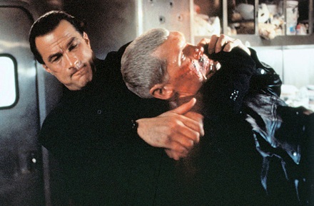 Por último, uno que si debe de jugarse el pellejo unas cuantas veces es Morris Chestnut interpretando a Bobby, un mozo que acaba haciendo equipo con Ryback. Chestnut volvería a trabajar años después con Seagal en ‘Al filo de la muerte’ (Don Michael Paul, 2003). Entre lo peor del reparto se encuentra la patética y nunca aclarada, sí fue así de intencionada, interpretación de Eric Bogosian. El actor nacido en Boston encarna al supuestamente pérfido y súper-cerebro Travis Dane. En realidad un mindundi con un portátil que incluso patalea como un niño desconsolado cuando su ordenador se queda sin conexión.