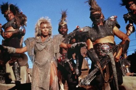 La estética de los personajes guarda cierta similitud con lo visto en anteriores entregas. Sin embargo, me atrevería a decir que es un refrito de ambas con elementos trash. Los guardias de Tía Ama conservan ese aire Mohawk con crestas que vimos en la segunda parte, luciendo algunos complementos de sexualidad un tanto ambigua. Y, por otra parte, la mayoría de ciudadanos de Negociudad parecen tan harapientos como se espera en un mundo post-nuclear. Pero el homoerotismo que podíamos encontrar en las dos anteriores películas queda reducido drásticamente. Supongo que esto último se debió a la moral hollywoodiense. Además, en esta ocasión, hay un abuso considerable de las protecciones de hockey a modo de armadura que podría haberse evitado.